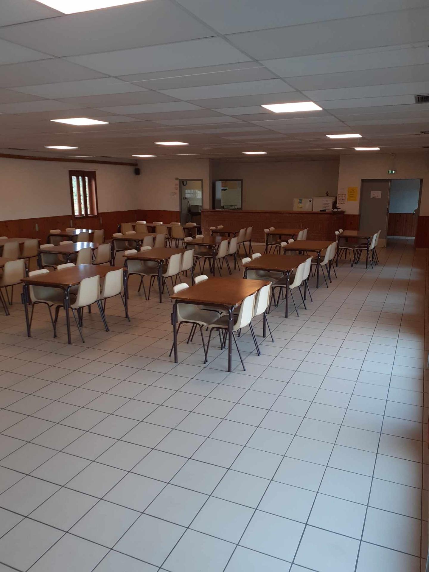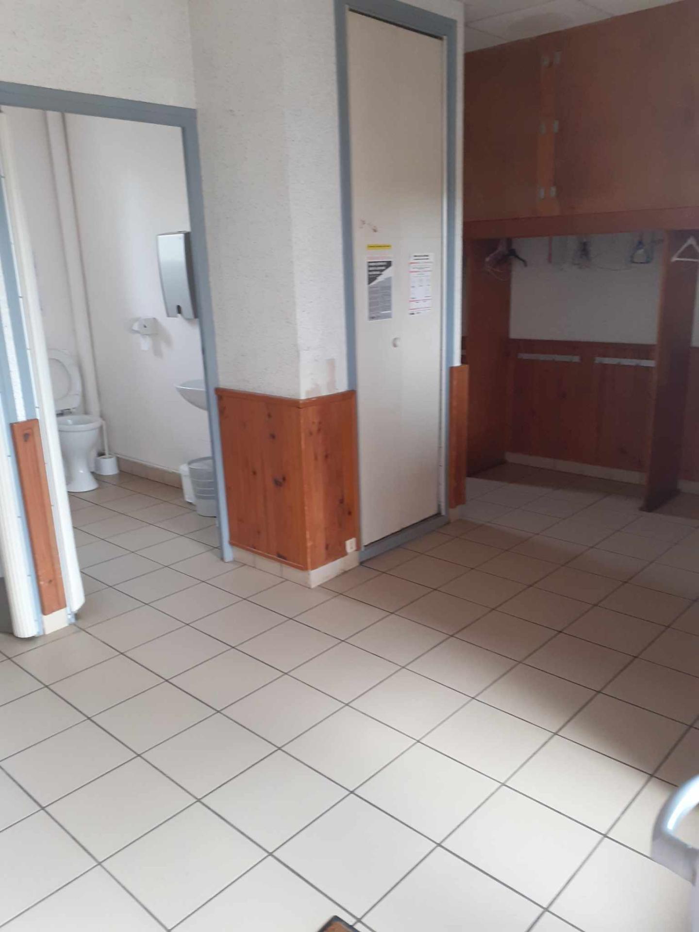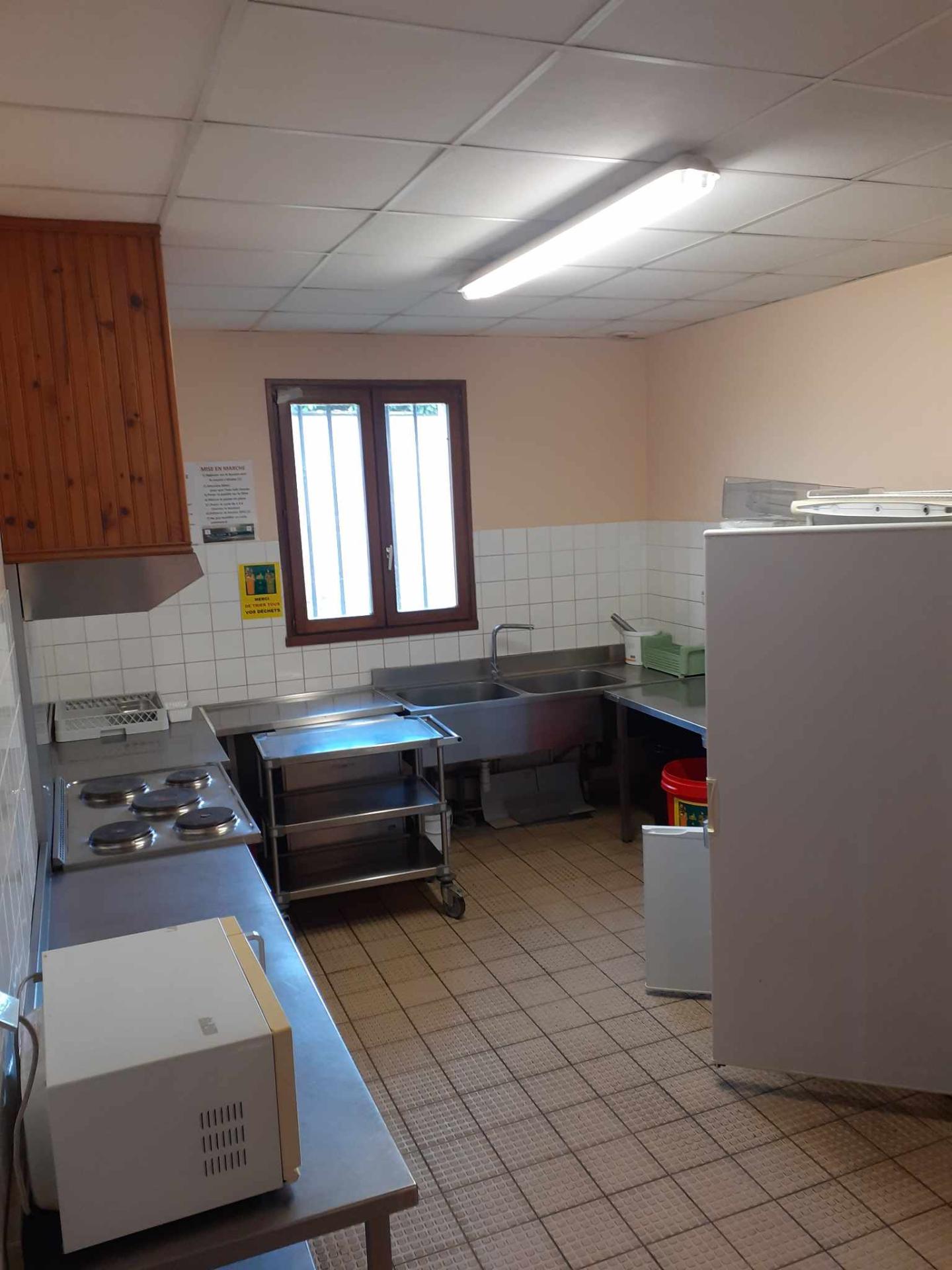 Salle du Rez de Chaussée : Entrée - Vestiaire - Toilettes - Cuisine équipée réfrigérateur, congélateur, fourneau 5 plaques électriques et four bergerie.